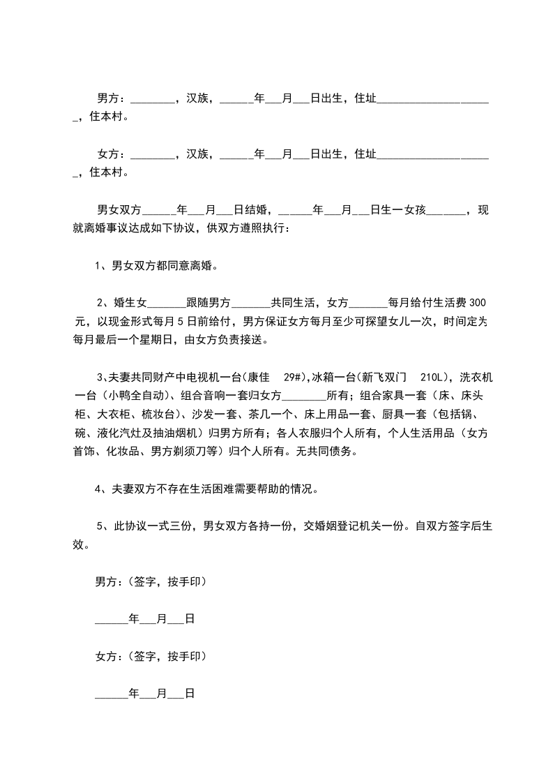 男女双方______年___月___日结婚,______年___月___日生一女孩_______,现就离婚事议达成如下协议,供双方遵照执行: