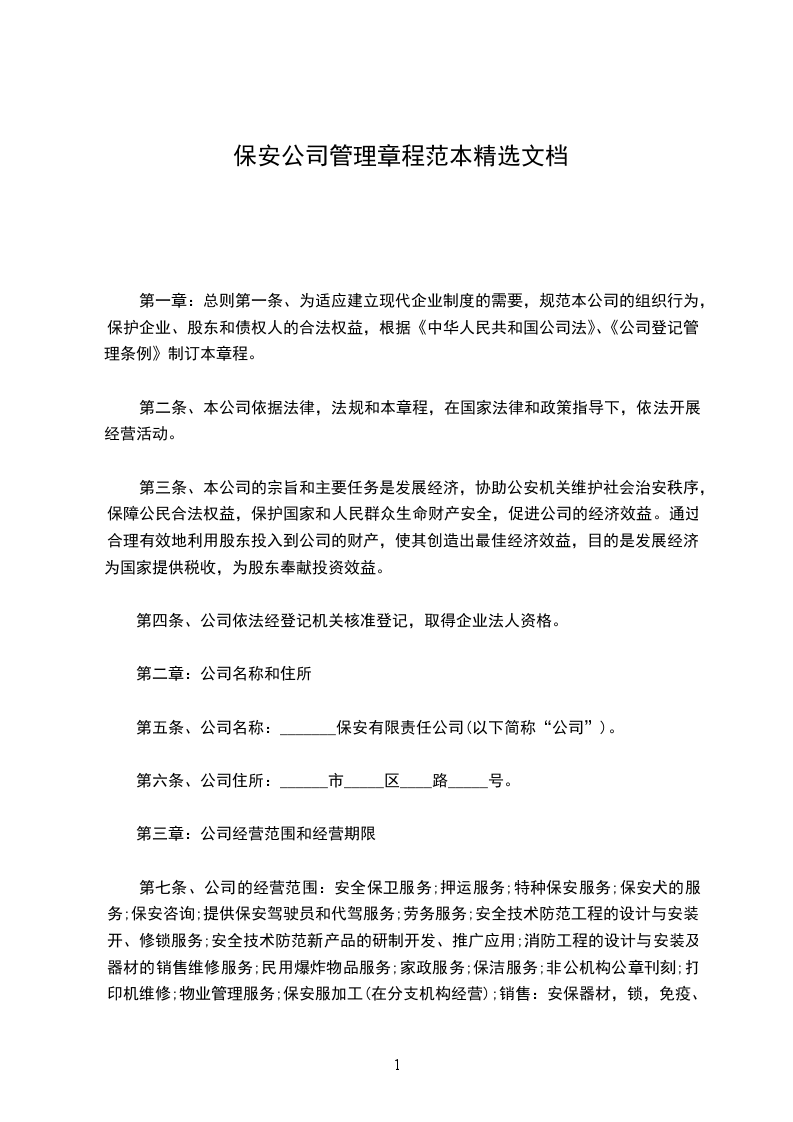 第一条、为适应建立现代企业制度的需要,规范本公司的组织行为,保护企业、股东和债权人的合法权益,根据《中华人民共和国公司法》、《公司登记管理条例》、《保安服务管理条例》,制订本章程。