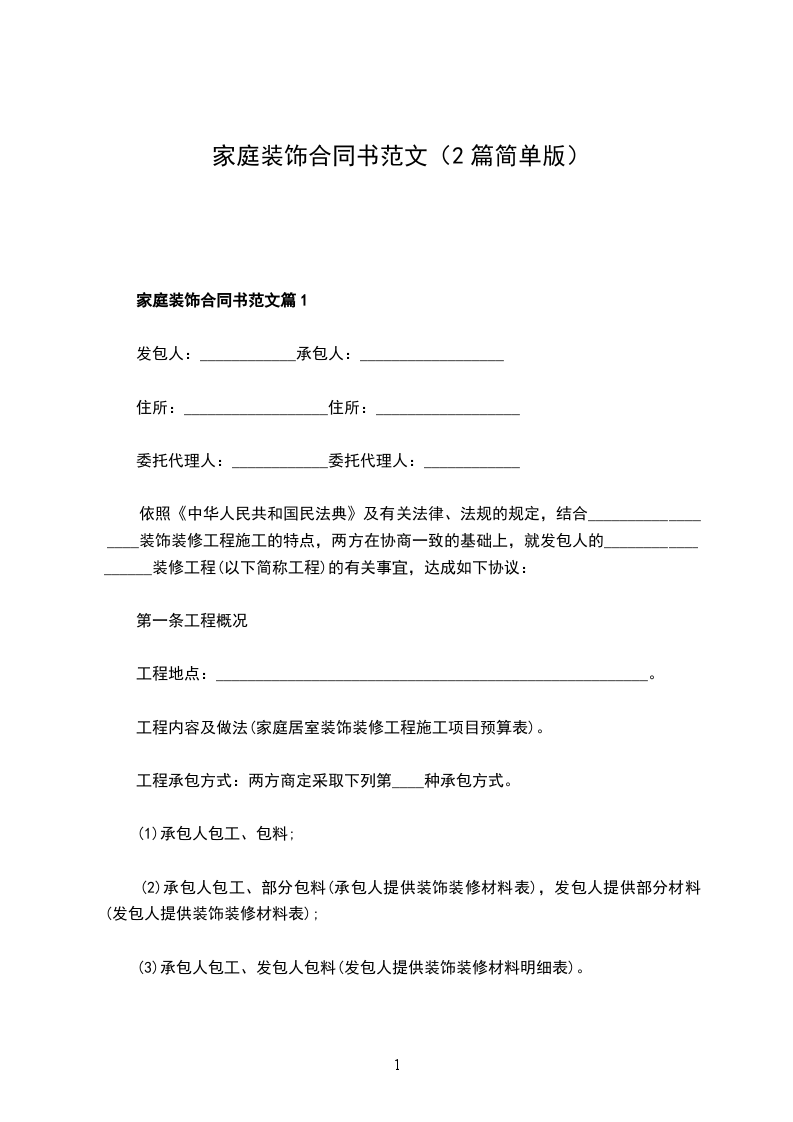 (1)发包人自行设计并提供施工图纸,图纸一式二份,发包人、承包人各一份(详见家庭居室装饰装修工程设计图纸);