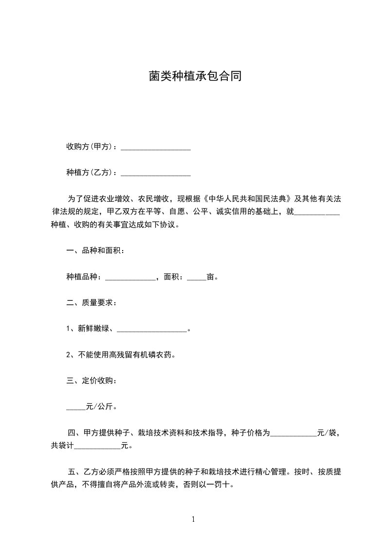 为了促进农业增效、农民增收,现根据《中华人民共和国民法典》及其他有关法律法规的规定,甲乙双方在平等、自愿、公平、诚实信用的基础上,就____________种植、收购的有关事宜达成如下协议。
