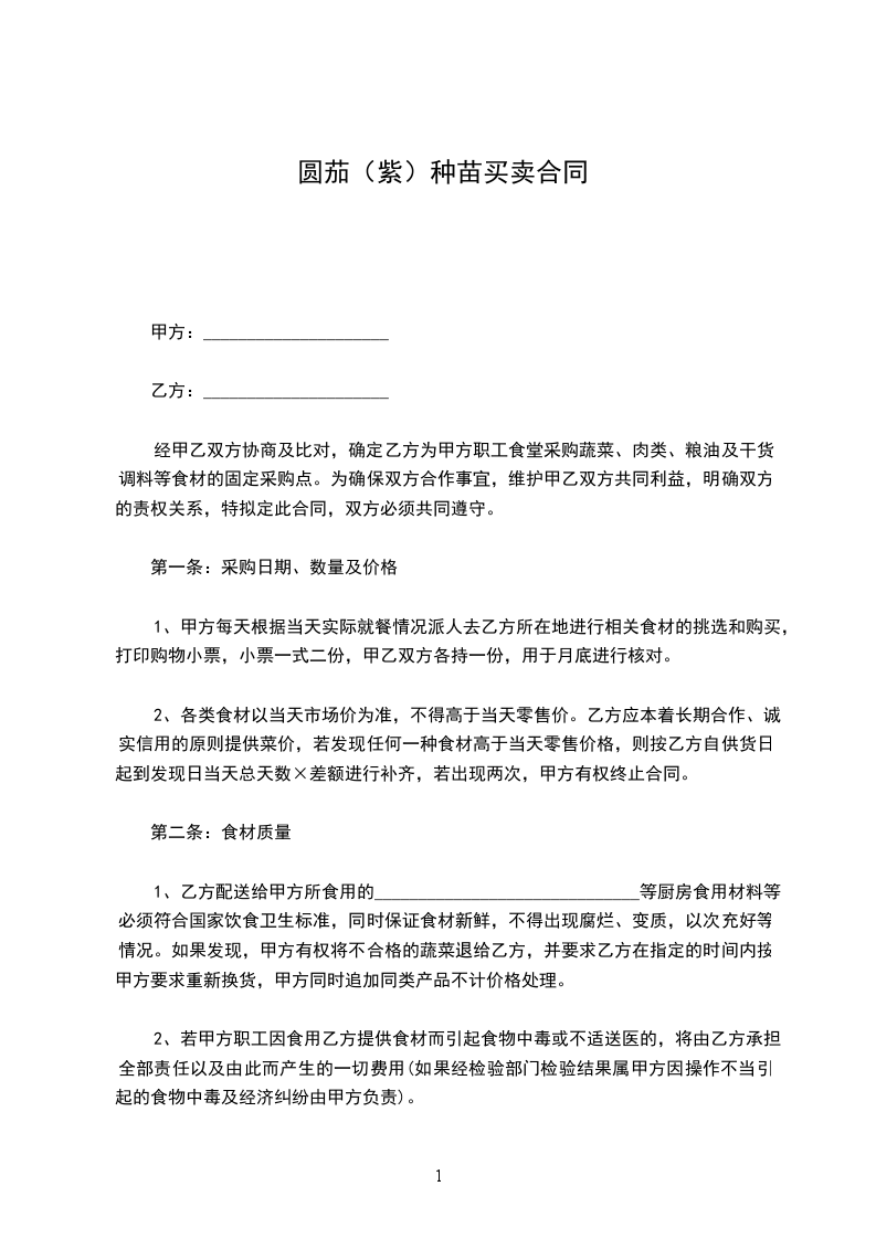 1、乙方为甲方提供蔬菜类产品约______种左右,供货价格乙方承诺在成本价格上加价______元/公斤—______元/公斤,必须保证为市场最低供货价格。