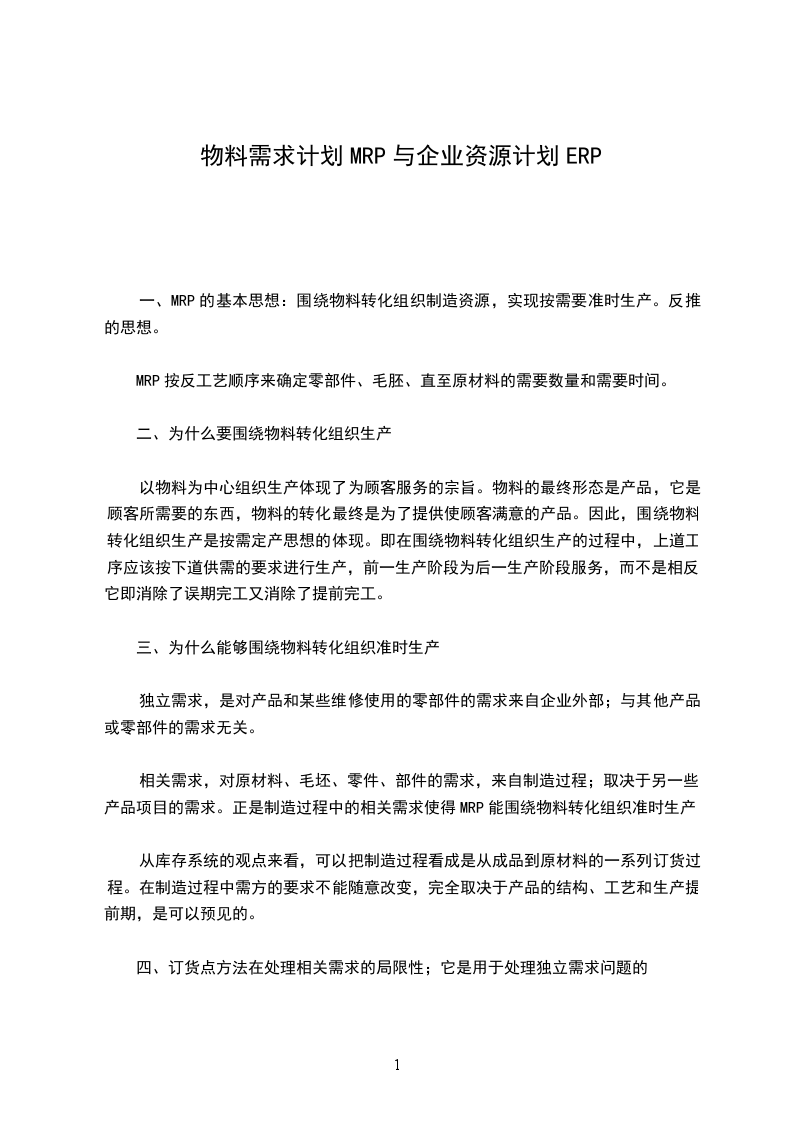 一、MRP的基本思想:围绕物料转化组织制造资源,实现按需要准时生产。反推的思想。