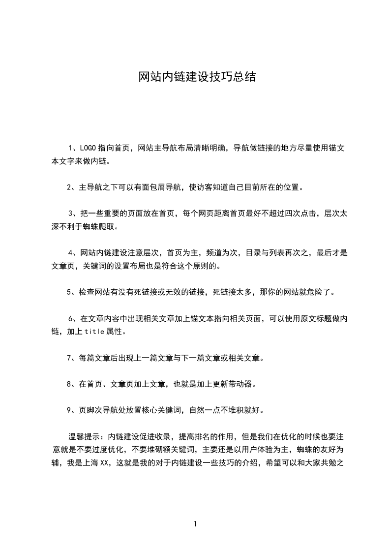 温馨提示:内链建设促进收录,提高排名的作用,但是我们在优化的时候也要注意就是不要过度优化,不要堆砌额关键词,主要还是以用户体验为主,蜘蛛的友好为辅,我是上海XX,这就是我的对于内链建设一些技巧的介绍,希望可以和大家共勉之。