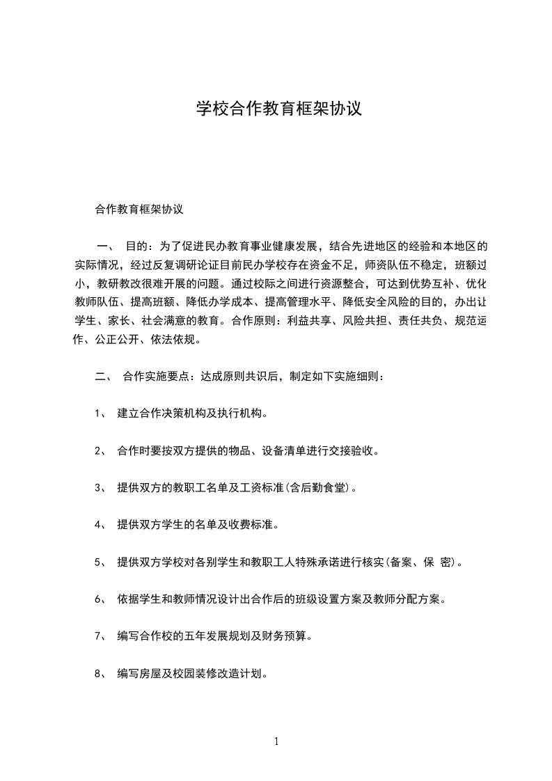 一、 目的:为了促进民办教育事业健康发展,结合先进地区的经验和本地区的实际情况,经过反复调研论证目前民办学校存在资金不足,师资队伍不稳定,班额过小,教研教改很难开展的问题。通过校际之间进行资源整合,可达到优势互补、优化教师队伍、提高班额、降低办学成本、提高管理水平、降低安全风险的目的,办出让学生、家长、社会满意的教育。合作原则:利益共享、风险共担、责任共负、规范运作、公正公开、依法依规。