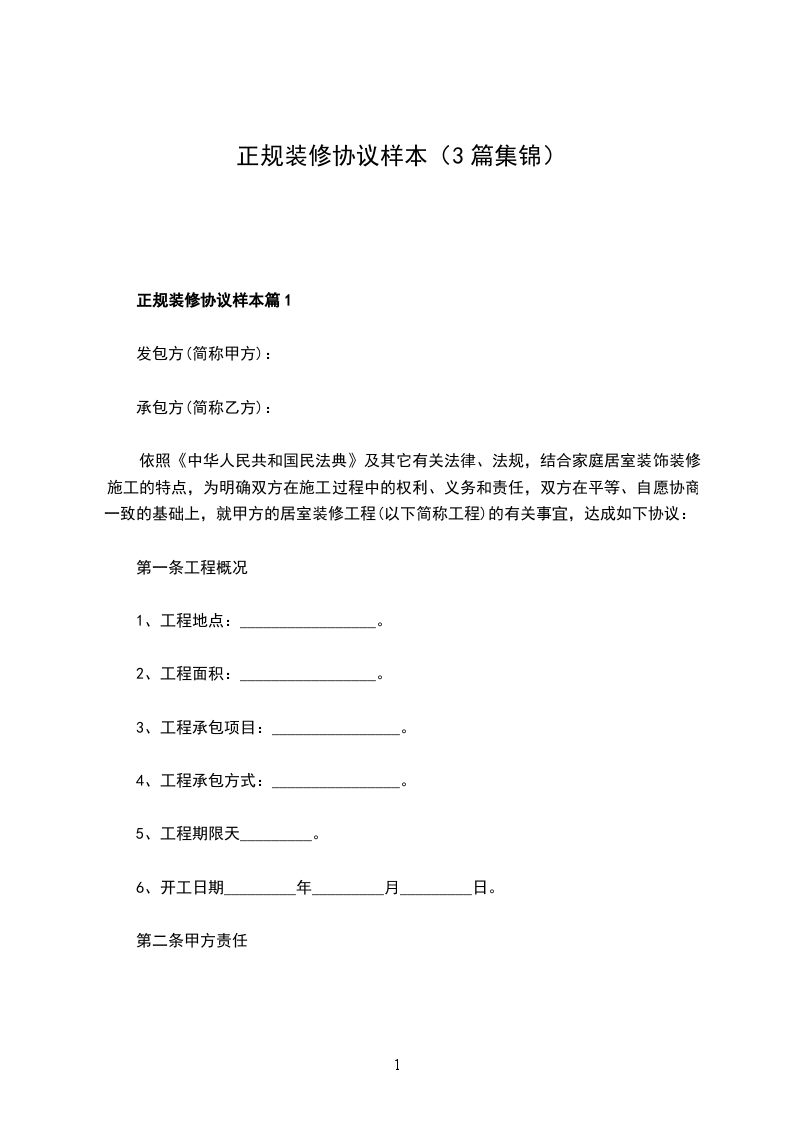 正规装修协议样本篇1