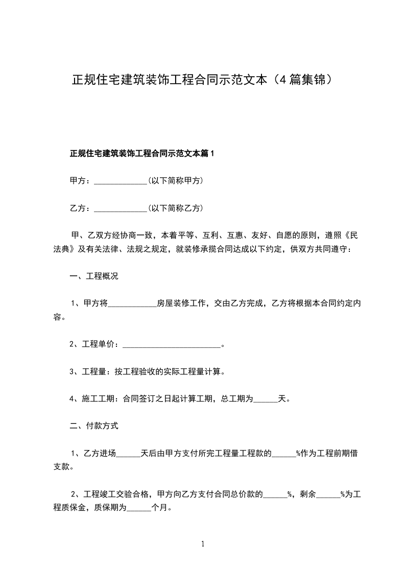 正规住宅建筑装饰工程合同示范文本篇1