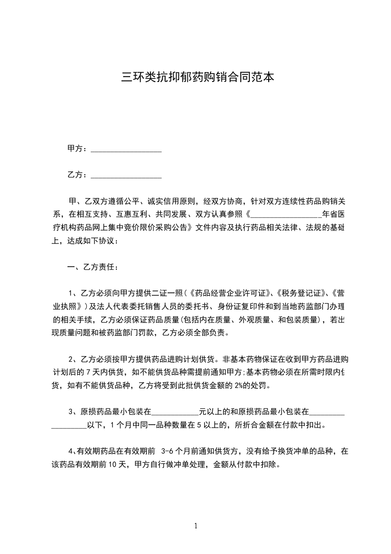 五、为保证药品质量,避免造成药品的浪费,甲方对已购进的药品应妥善储存和管理。如因乙方药品质量造成的一切损失由乙方承担全部责任;如因甲方库存条件不符合药品正常储存,造成的药品质量问题,由甲方承担全部责任。