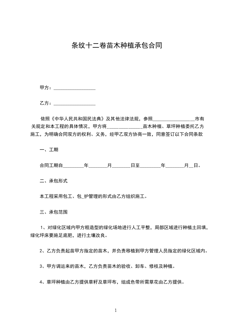 依照《中华人民共和国民法典》及其他法律法规,参照__________________市有关规定和本工程的具体情况,甲方将_______________苗木种植、草坪种植委托乙方施工,为明确合同双方的权利、义务,经甲乙双方协商一致,同意签订以下合同条款。
