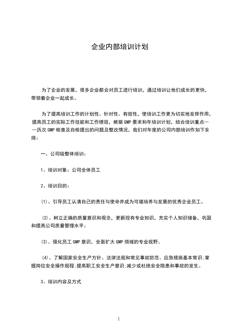 为了提高培训工作的计划性、针对性、有效性,使培训工作更为切实地发挥作用,提高员工的实际工作技能和工作绩效,根据GMP要求和年培训计划,结合培训重点——历次GMP检查及自检提出的问题及整改情况,我们对年度的公司内部培训作如下安排:
