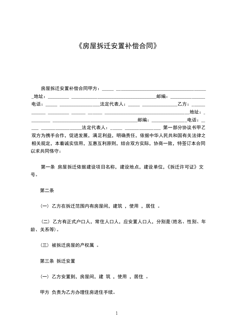 房屋拆迁安置补偿合同甲方:_____ _______________________________________地址:_________ ____________________________________邮编:_______________电话:_____ _________________法定代表人:_____ _______________乙方:______ ______ _________ ______ ______ ____________________________________地址:_________ ____________________________________邮编:_______________电话:_____ _________________法定代表人:_____ _______________ 第一部分协议书甲乙双方为携手合作,促进发展,满足利益,明确责任,依据中华人民共和国有关法律之相关规定,本着诚实信用,互惠互利原则,结合双方实际,协商一致,特签订本合同,以求共同恪守:
