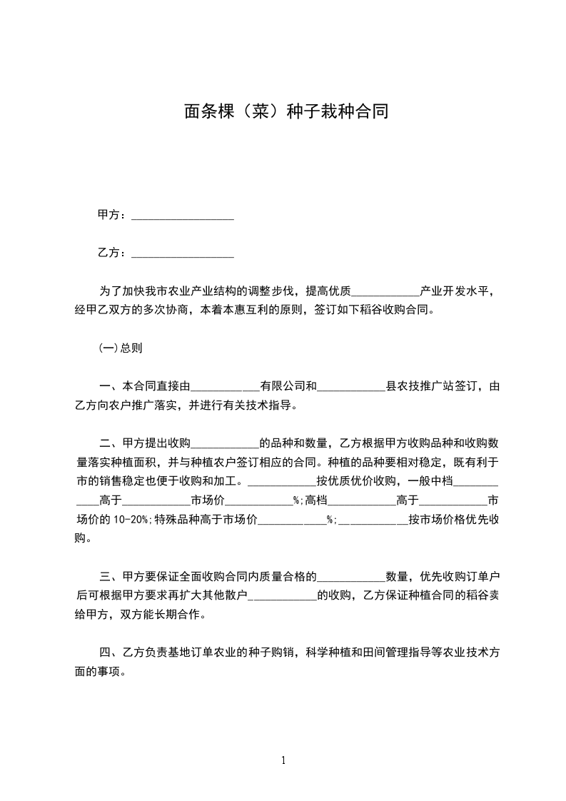 面条棵(菜)种子买卖合同