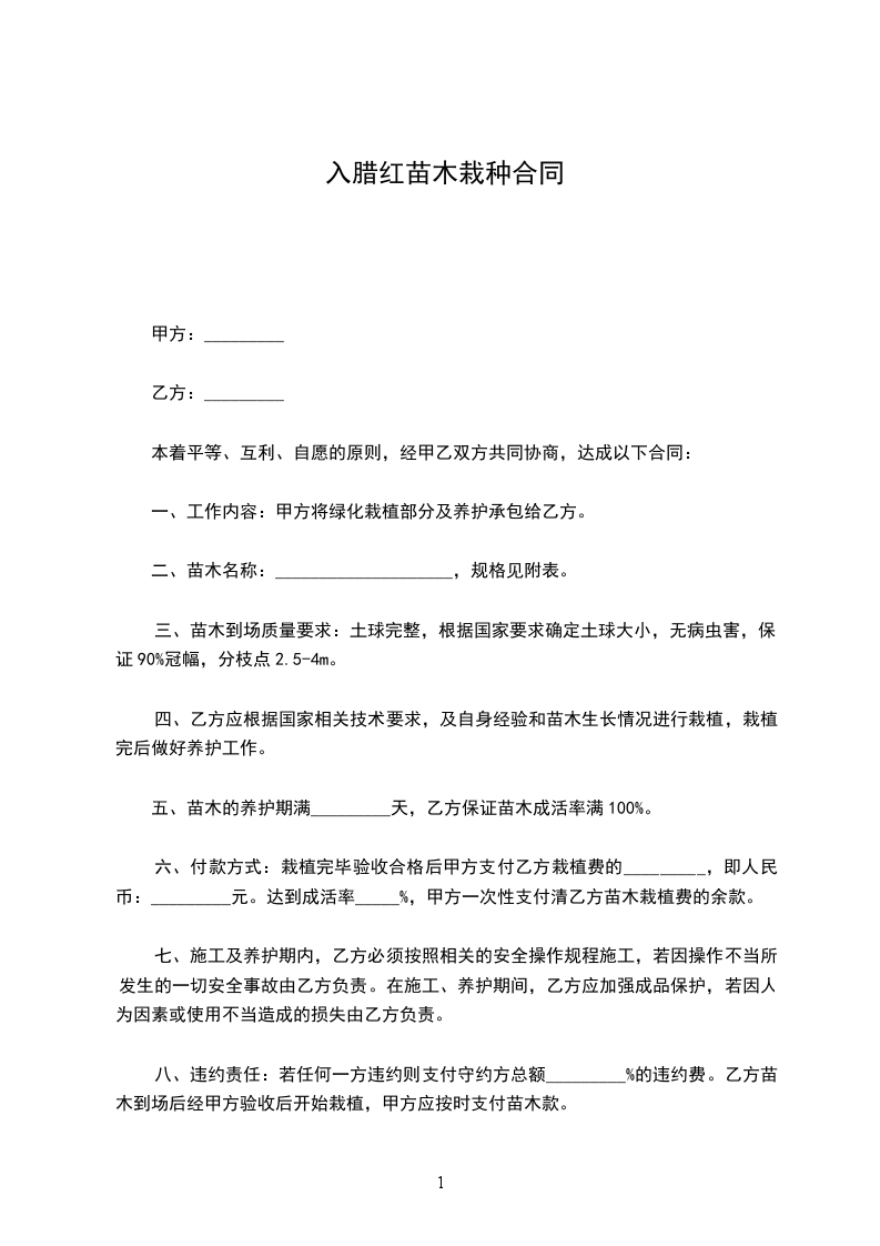 八、违约责任:若任何一方违约则支付守约方总额_________%的违约费。乙方苗木到场后经甲方验收后开始栽植,甲方应按时支付苗木款。