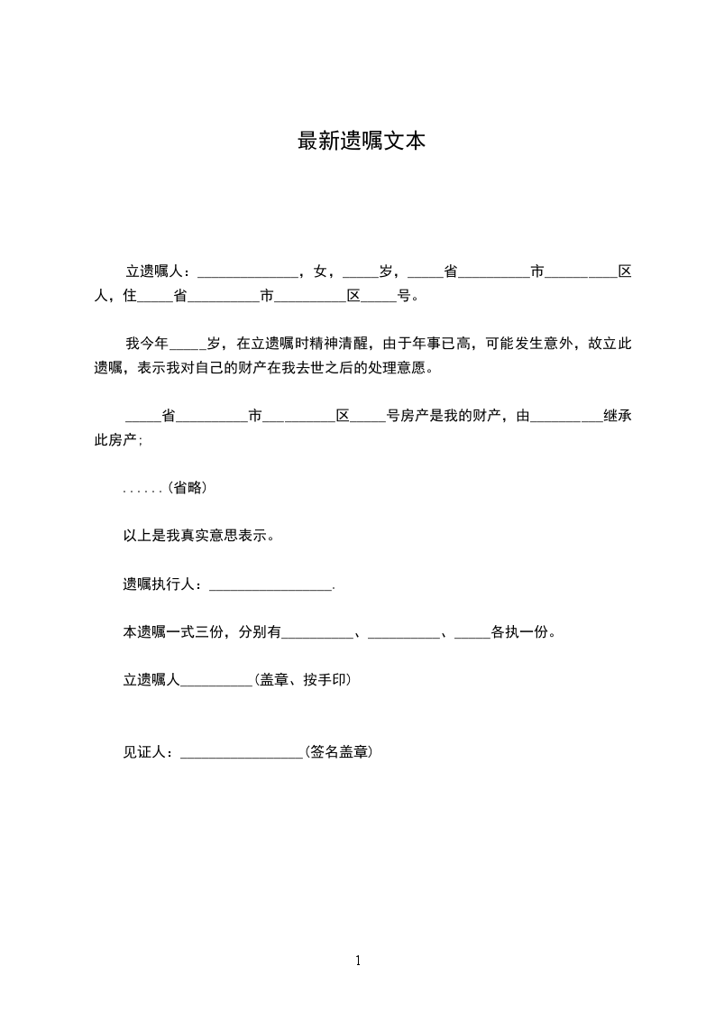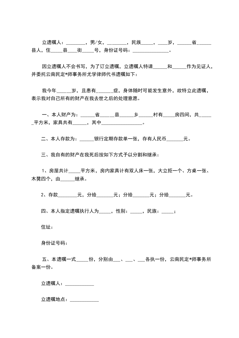 立遗嘱人:________,男/女,________,民族_____,____岁,______省______县人,住_____县____街_____号,身份证号码:_______________。