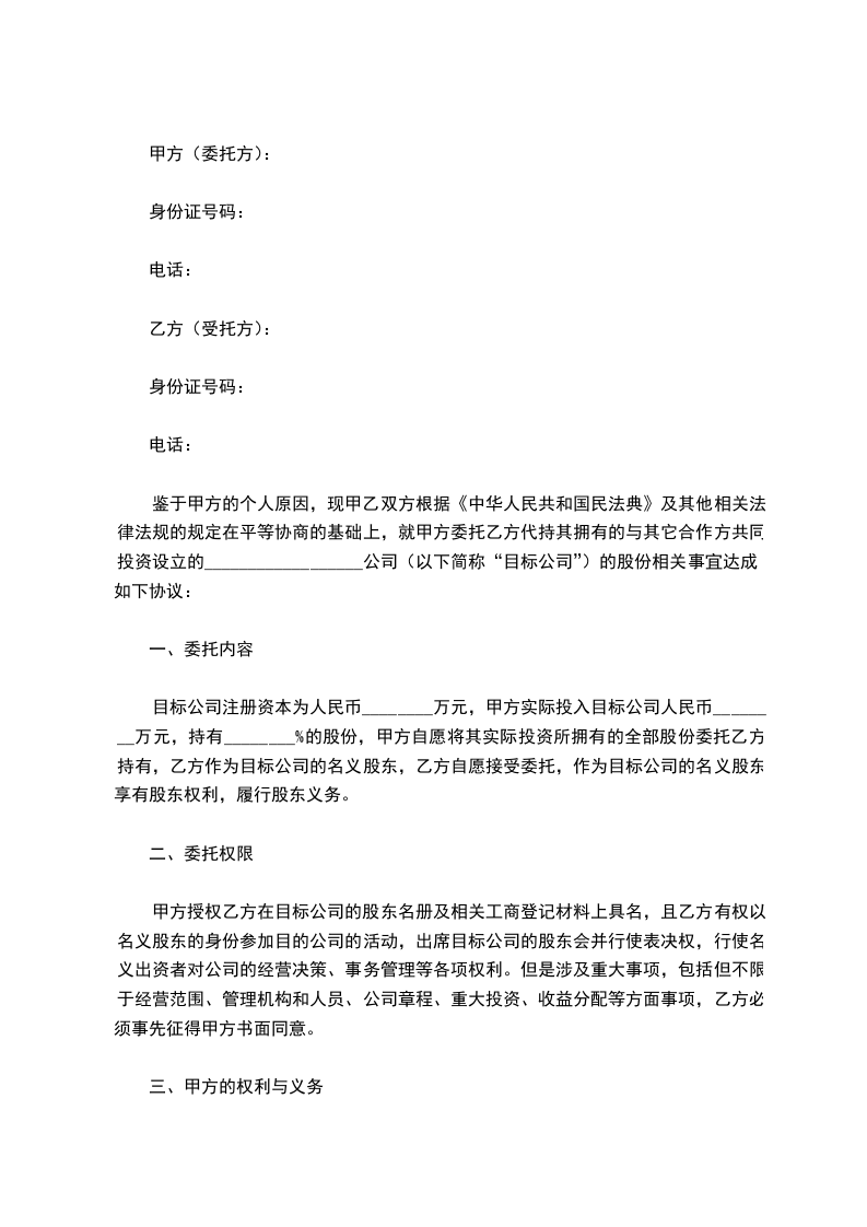 鉴于甲方的个人原因,现甲乙双方根据《中华人民共和国民法典》及其他相关法律法规的规定在平等协商的基础上,就甲方委托乙方代持其拥有的与其它合作方共同投资设立的__________________公司(以下简称“目标公司”)的股份相关事宜达成如下协议: