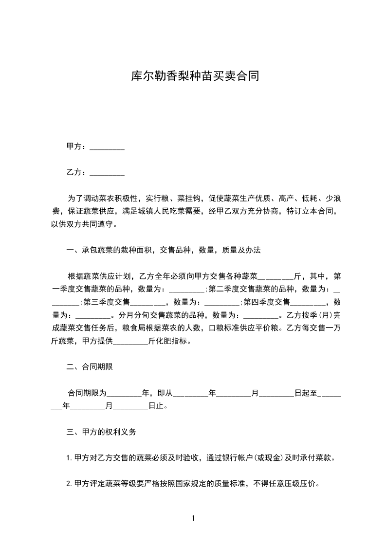 根据蔬菜供应计划,乙方全年必须向甲方交售各种蔬菜_________斤,其中,第一季度交售蔬菜的品种,数量为:_________;第二季度交售蔬菜的品种,数量为:_________;第三季度交售_________,数量为:_________;第四季度交售_________,数量为:_________。分月分旬交售蔬菜的品种,数量为:_________。乙方按季(月)完成蔬菜交售任务后,粮食局根据菜农的人数,口粮标准供应平价粮。乙方每交售一万斤蔬菜,甲方提供_________斤化肥指标。