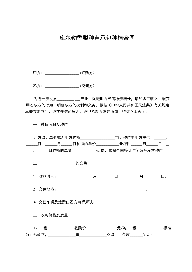 1.甲方如无故拖延乙方上交蔬菜时间,或故意压级压价,除应赔偿乙方的损失外,应向乙方偿付违约金_________元。