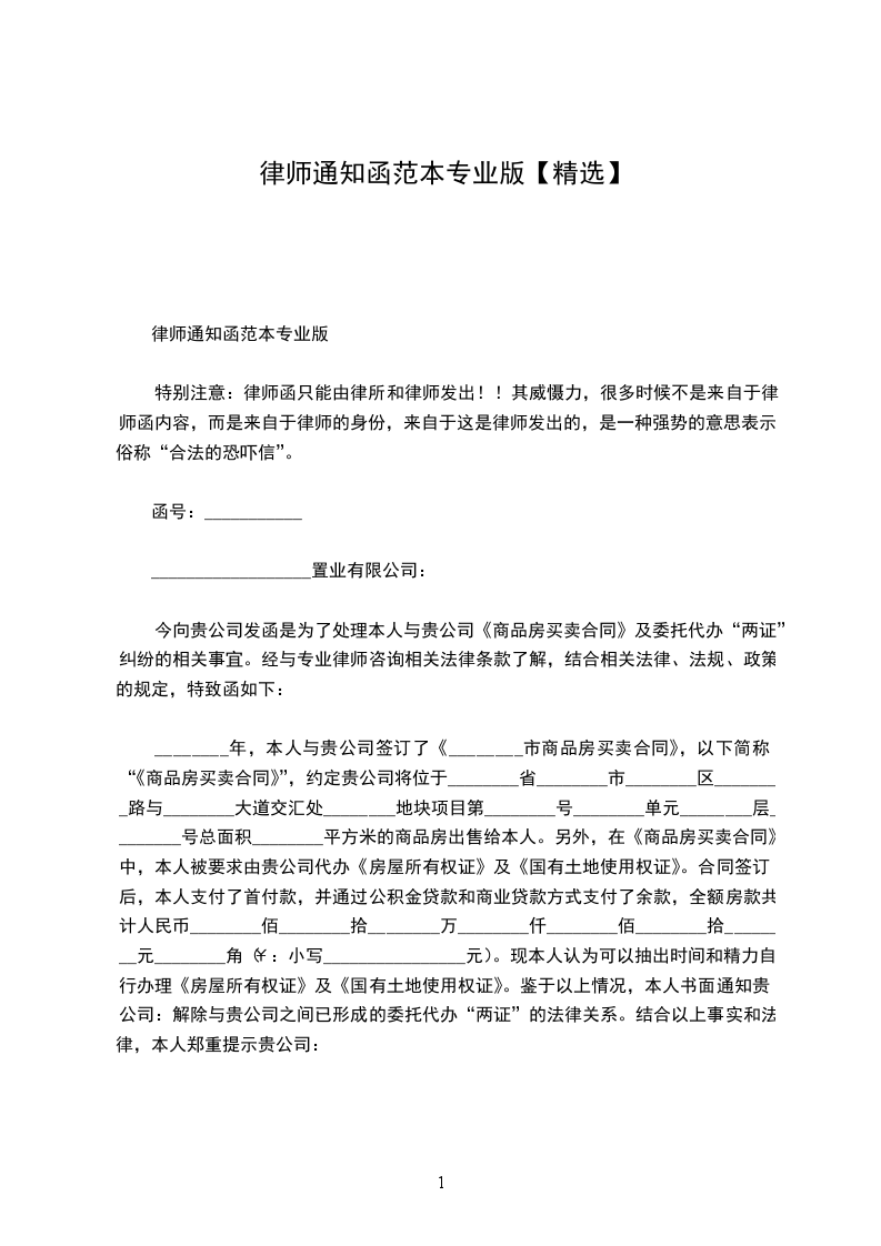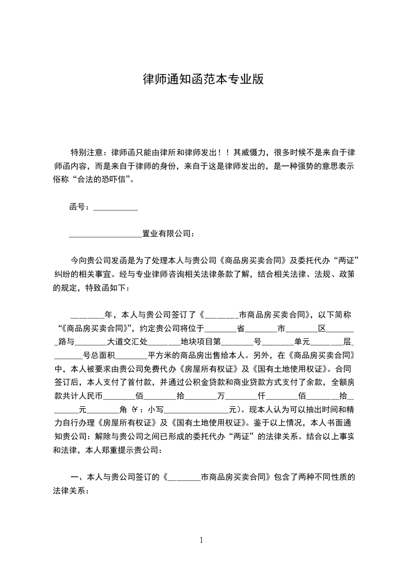 ________年,本人与贵公司签订了《________市商品房买卖合同》,以下简称“《商品房买卖合同》”,约定贵公司将位于________省________市________区________路与________大道交汇处________地块项目第________号________单元________层________号总面积________平方米的商品房出售给本人。另外,在《商品房买卖合同》中,本人被要求由贵公司免费代办《房屋所有权证》及《国有土地使用权证》。合同签订后,本人支付了首付款,并通过公积金贷款和商业贷款方式支付了余款,全额房款共计人民币________佰________拾________万________仟________佰________拾________元________角(¥:小写________________元)。现本人认为可以抽出时间和精力自行办理《房屋所有权证》及《国有土地使用权证》。鉴于以上情况,本人书面通知贵公司:解除与贵公司之间已形成的委托代办“两证”的法律关系。结合以上事实和法律,本人郑重提示贵公司: