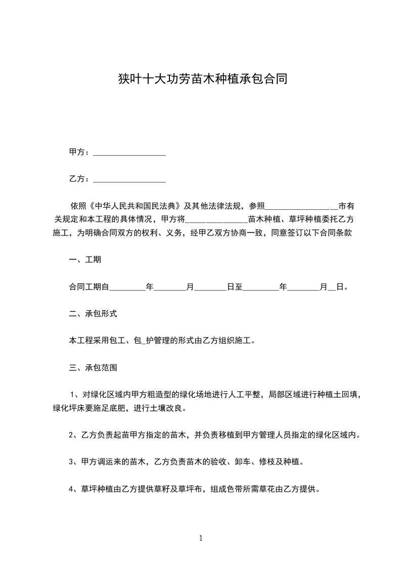 依照《中华人民共和国民法典》及其他法律法规,参照__________________市有关规定和本工程的具体情况,甲方将_______________苗木种植、草坪种植委托乙方施工,为明确合同双方的权利、义务,经甲乙双方协商一致,同意签订以下合同条款。