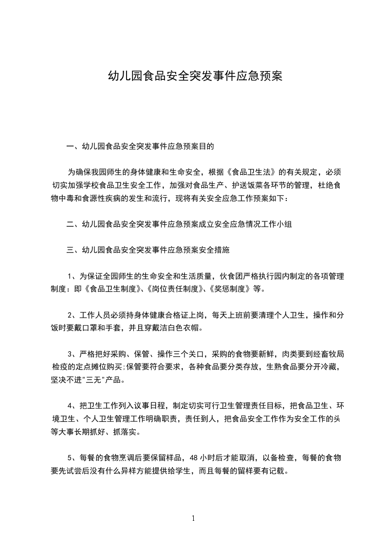 做好幼儿园食品卫生安全工作,减少群体性食物中毒事件的发生,保障师幼的身体健康和生命安全,幼儿园本着为幼儿和教师的身体健康的目的出发,在加强幼儿园常规管理的同时,加强对食堂食品卫生工作管理,应对幼儿非正常中毒或疑似食物中毒事故,特制定本预案。