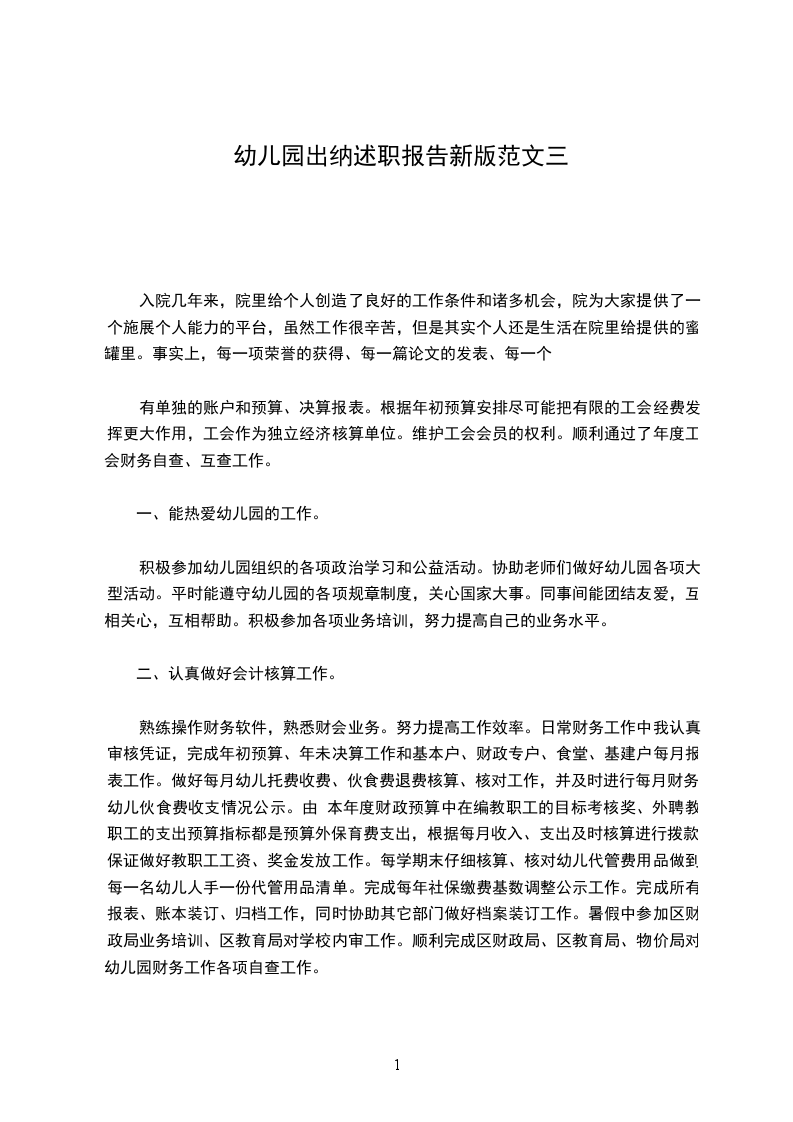 熟练操作财务软件,熟悉财会业务。努力提高工作效率。日常财务工作中我认真审核凭证,完成年初预算、年未决算工作和基本户、财政专户、食堂、基建户每月报表工作。做好每月幼儿托费收费、伙食费退费核算、核对工作,并及时进行每月财务、幼儿伙食费收支情况公示。由 本年度财政预算中在编教职工的目标考核奖、外聘教职工的支出预算指标都是预算外保育费支出,根据每月收入、支出及时核算进行拨款,保证做好教职工工资、奖金发放工作。每学期末仔细核算、核对幼儿代管费用品做到每一名幼儿人手一份代管用品清单。完成每年社保缴费基数调整公示工作。完成所有报表、账本装订、归档工作,同时协助其它部门做好档案装订工作。暑假中参加区财政局业务培训、区教育局对学校内审工作。顺利完成区财政局、区教育局、物价局对幼儿园财务工作各项自查工作。