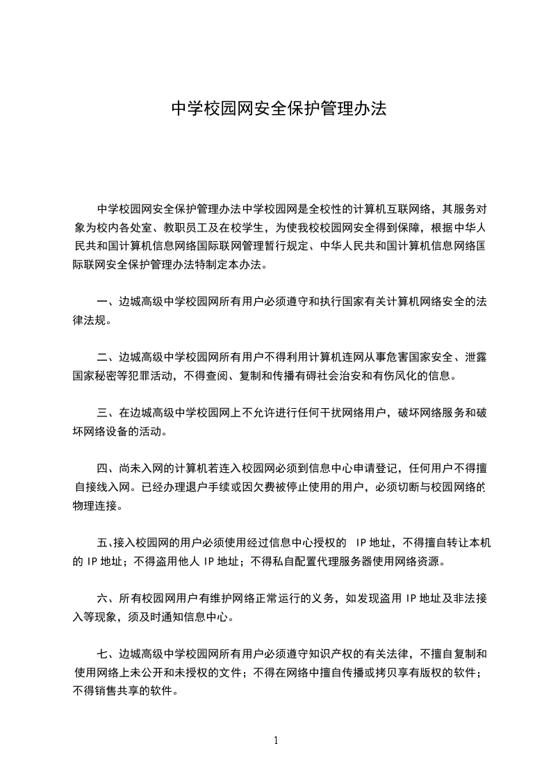 中学校园网安全保护管理办法中学校园网是全校性的计算机互联网络,其服务对象为校内各处室、教职员工及在校学生,为使我校校园网安全得到保障,根据中华人民共和国计算机信息网络国际联网管理暂行规定、中华人民共和国计算机信息网络国际联网安全保护管理办法特制定本办法。