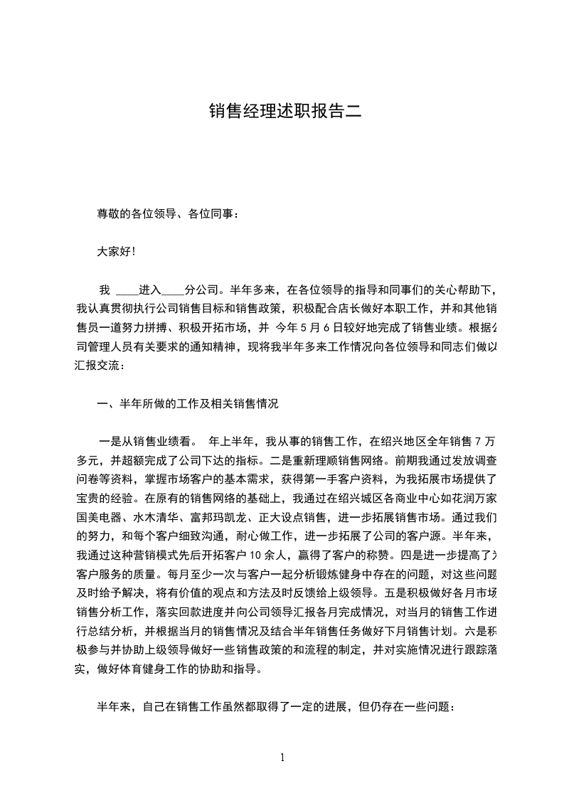 我 ____进入____分公司。半年多来,在各位领导的指导和同事们的关心帮助下,我认真贯彻执行公司销售目标和销售政策,积极配合店长做好本职工作,并和其他销售员一道努力拼搏、积极开拓市场,并 今年5月6日较好地完成了销售业绩。根据公司管理人员有关要求的通知精神,现将我半年多来工作情况向各位领导和同志们做以汇报交流:
