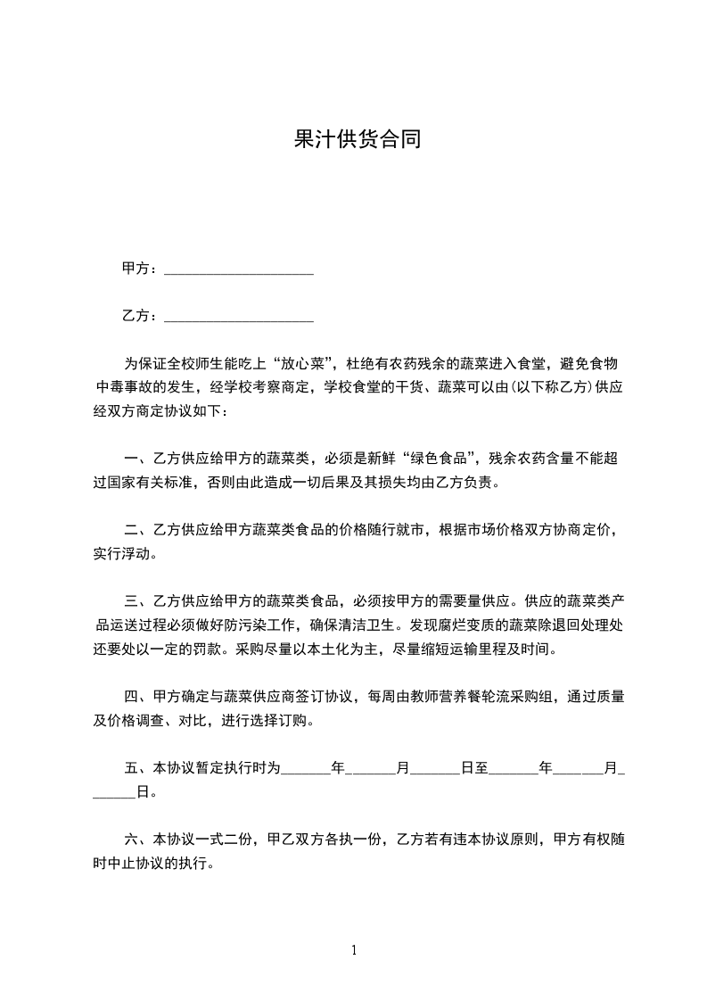一、乙方供应给甲方的蔬菜类,必须是新鲜“绿色食品”,残余农药含量不能超过国家有关标准,否则由此造成一切后果及其损失均由乙方负责。