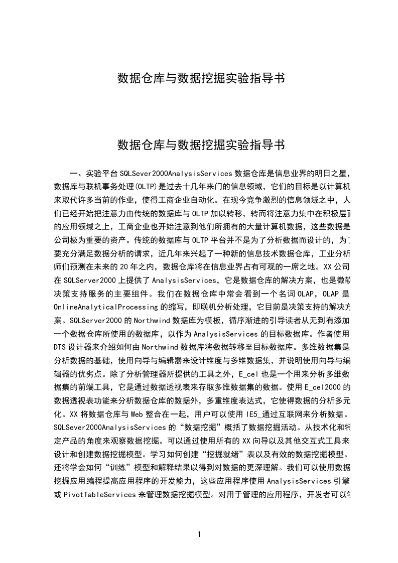 一、实验平台SQLSever2000AnalysisServices数据仓库是信息业界的明日之星,数据库与联机事务处理(OLTP)是过去十几年来门的信息领域,它们的目标是以计算机来取代许多当前的作业,使得工商企业自动化。在现今竞争激烈的信息领域之中,人们已经开始把注意力由传统的数据库与OLTP加以转移,转而将注意力集中在积极层面的应用领域之上,工商企业也开始注意到他们所拥有的大量计算机数据,这些数据是公司极为重要的资产。传统的数据库与OLTP平台并不是为了分析数据而设计的,为了要充分满足数据分析的请求,近几年来兴起了一种新的信息技术数据仓库,工业分析师们预测在未来的20年之内,数据仓库将在信息业界占有可观的一席之地。XX公司在SQLServer2000上提供了AnalysisServices,它是数据仓库的解决方案,也是微软决策支持服务的主要组件。我们在数据仓库中常会看到一个名词OLAP,OLAP是OnlineAnalyticalProcessing的缩写,即联机分析处理,它目前是决策支持的解决方案。SQLServer2000的Northwind数据库为模板,循序渐进的引导读者从无到有添加一个数据仓库所使用的数据库,以作为AnalysisServices的目标数据库。作者使用DTS设计器来介绍如何由Northwind数据库将数据转移至目标数据库。多维数据集是分析数据的基础,使用向导与编辑器来设计维度与多维数据集,并说明使用向导与编辑器的优劣点。除了分析管理器所提供的工具之外,E_cel也是一个用来分析多维数据集的前端工具,它是通过数据透视表来存取多维数据集的数据。使用E_cel2000的数据透视表功能来分析数据仓库的数据外,多重维度表达式,它使得数据的分析多元化。XX将数据仓库与Web整合在一起,用户可以使用IE5_通过互联网来分析数据。SQLSever2000AnalysisServices的“数据挖掘”概括了数据挖掘活动。从技术化和特定产品的角度来观察数据挖掘。可以通过使用所有的XX向导以及其他交互式工具来设计和创建数据挖掘模型。学习如何创建“挖掘就绪”表以及有效的数据挖掘模型。还将学会如何“训练”模型和解释结果以得到对数据的更深理解。我们可以使用数据挖掘应用编程提高应用程序的开发能力,这些应用程序使用AnalysisServices引擎或PivotTableServices来管理数据挖掘模型。对用于管理的应用程序,开发者可以学会如何创建带有和AnalysisManager同样功能的应用程序。对于依赖现存模型进行预测的应用程序,开发者可以学习如何通过编程来提交预测查询。