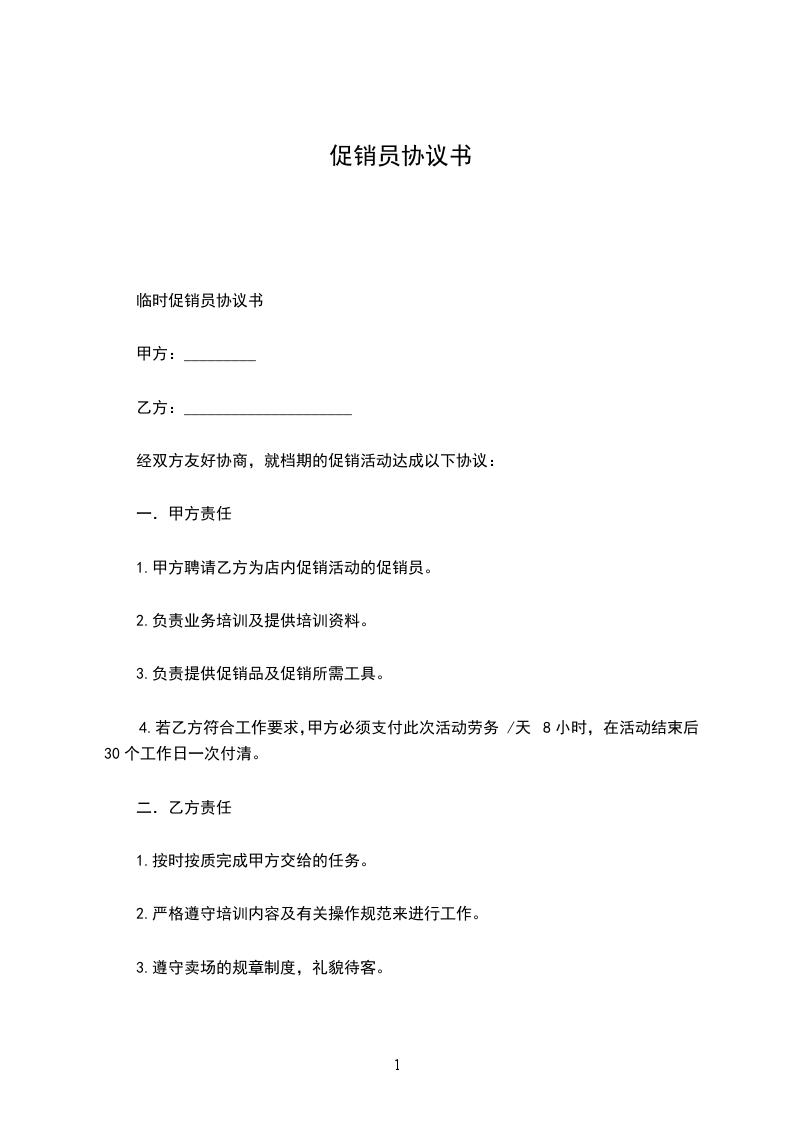 1、甲方分配乙方在________岗位担任促销员职务。在正常情况下乙方必须完成工作任务,具体工作任务为:______________________________________。