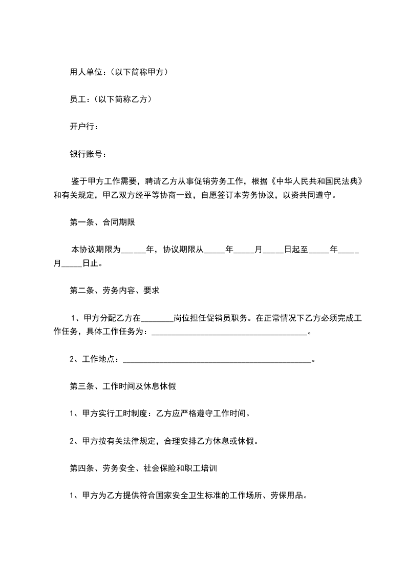 鉴于甲方工作需要,聘请乙方从事促销劳务工作,根据《中华人民共和国民法典》和有关规定,甲乙双方经平等协商一致,自愿签订本劳务协议,以资共同遵守。