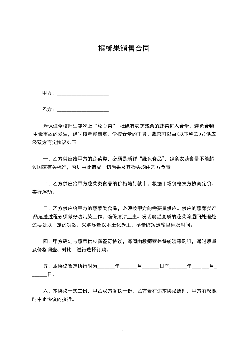 一、乙方供应给甲方的蔬菜类,必须是新鲜“绿色食品”,残余农药含量不能超过国家有关标准,否则由此造成一切后果及其损失均由乙方负责。