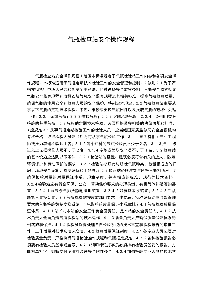 气瓶检查站安全操作规程1范围本标准规定了气瓶检验站工作内容和各项安全操作规程。本标准适用于气瓶定期技术检验工作的安全管理和控制。2总则2.1为了严格贯彻执行中华人民共和国安全生产法、特种设备安全监察条例、气瓶安全监察规定、气瓶安全监察规程和溶解乙炔气瓶安全监察规程及其相关标准,提高气瓶检验质量,确保气瓶的使用安全和检验人员的安全保护,特制定本规定。2.2气瓶检验站主要从事以下气瓶的定期技术检验、漆色、维修或更换气瓶附件以及报废气瓶的破坏性处理工作:2.2.1无缝气瓶;2.2.2焊接气瓶;2.2.3溶解乙炔气瓶;2.2.4上级部门委托检验的各类气瓶。2.3气瓶的定期技术检验,必须严格遵守相关的法律法规和标准。3般规定3.1从事气瓶定期检验工作的检验人员,应当经国家质监总局安全监察机构考核合格,取得检验人员证书后方可从事气瓶检验工作:3.1.1至少有相关专业工程师或压力容器检验师1名;3.1.2每个瓶种的气瓶检验员不少于2名;3.1.3持II级证以上无损探伤人员不少于2名;3.1.4专职或兼职安全员不少于1名。3.2检验站的基本设施应达到以下条件:3.2.1检验站的设置、建筑必须符合有关的放火、防爆、环境保护和劳动保护的要求;3.2.2检验站必须有与所检气瓶种类、数量相适应的厂房、场地安全设施、检测设备和工器具;3.2.3检验站必须建立与所检气瓶相适应,能确保检验质量的质量保证体系、规章制度、并有相应的标准、规范等技术资料;3.2.4检验站应有符合环保、公安、劳动保护要求的处理易燃、有害气体和残液的装置:3.2.4.1氢气余气排放静电接地装置;3.2.4.2残氯碱吸收装置;3.2.4.3乙炔瓶氮气置换装置。3.3气瓶检验站按质监部门要求,建立满足特种设备动态监督管理要求的气瓶检验数据交换系统。4气瓶检验质量保证体系和制度4.1气瓶检验质量保证体系:4.1.1站长对本站的安全工作负全面责任,是本站的安全责任人;4.1.2技术负责人全面负责气瓶检验站的技术运作;4.1.3质量负责人应确保质量保证体系得到实施和保持。4.1.4检验员负责处理各自检验系统的技术事宜和检验报告的审批工作,工作质量对技术负责人负责。4.2检验质量保证制度:4.2.1各专业人员必须对检验质量负责,严格执行气瓶检验操作规程和气瓶报废规定;4.2.2各种检验报告必须要有检验人员签字或盖章;4.2.3钢印标记打字员必须持有检验员签发的报告,方能对单打字,钢瓶交付使用前必须安全附件齐全;4.2.4加强检验专业人员的技术学习和培训,必须考核合格后才能上岗检验,每年最少进行一次技术考核,考核成绩要存档备查;4.2.5对气瓶检验质量实行自查、互检、抽检制度是气瓶检验站经济考核的重要内容。发现检验质量事故必须重罚,以加强管理。4.3气瓶检验用计量仪器、仪表定期检验管理制度4.3.1检验站用计量仪器由气瓶检验站委托本单位计控中心校验;4.3.2气瓶称重衡器的检验周期为三个月,并要求其最大刻度值为常用重量的1.5倍至3倍;4.3.3在用试验系统至少应配有两个直径不少于100腿、级别不低于1.5级的强检压力表。水压试验用的强检压力表,检验周期为一个月;乙炔瓶试压系统的强检压力表,检验周期为三个月。所有的压力表器最大读数应为气瓶试压值的1.5至3倍;4.3.4仪器和压力表检验合格后由测试单位加盖铅封或标签。未经检验合格或超过检验期限的衡器和压力表,一律不准使用;4.3.5仪器、仪表检验由计量管理员统一计划送检,管理工作按本企业标准计量器具分级管理办法执行。4.4气瓶报废管理制度4.4.1经检验鉴定为不合格的气瓶,按标准准予以报废;4.4.2气瓶报废工作由各瓶种检验员负责复检、鉴定和填写签署检验报告和报废通知书;4.4.3报废的气瓶,经清洗后,在气瓶检验站安全员的监护下,作破坏性处理;4.4.4属于用户所有的报废气瓶,发给报废通知书。4.5用户意见反馈处理制度4.5.1经检验站鉴定合格的气瓶,送回充气单位和用户,本站确保不存在安全隐患,为用户提供绝对的安全可靠性;4.5.2气瓶运转期间发现有下列问题由本站收回处理,反馈至技术负责人,作专档记录:4.5.2.1瓶体有影响强度的任何缺陷;4.5.2.2气瓶标志、漆色不清楚或不齐全或有错误;4.5.2.3瓶阀有泄漏或不符合充气要求。4.5.3技术负责人应及时组织失控部门对质量事故进行分析,作出处理意见和补救措施。4.6接受上级部门监督检查制度4.6.1气瓶检验站接受上级部门的监督和检查,经常与上级部门联系和汇报工作;4.6.2气瓶检验站定期向质监部门报告检验情况,工作中若发生检验质量事故或其它气瓶事故时应及时向质监部门或有关部门汇报,并听取其对事故的处理意见。4.6.3技术负责人代表检验站接受质监部门的监督和指导,对质监部门下达的有关新精神、新规定、新标准负责及时贯彻实施。4.6.4各级检验人员可直接向质监部门或上级领导如实反映气瓶检验站的不足之处。5气瓶检验周期和使用年限5.1各类气瓶的检验周期,不得超过下列规定:5.1.1盛装腐蚀性气体的气瓶,每两年检验一次;5.1.2盛装一般性气体的气瓶,每三年检验一次;5.1.3盛装惰性气体的气瓶,每五年检验一次;5.1.4气瓶在使用过程中,发现有严重腐蚀、损伤或对其安全可靠性有怀疑时,应提前进行检验。库存和停用时间超过一个检验周期的气瓶,启用前应进行检验。5.2超过使用年限的气瓶按报废处理5.2.1钢质无缝气瓶,使用年限为30年。5.