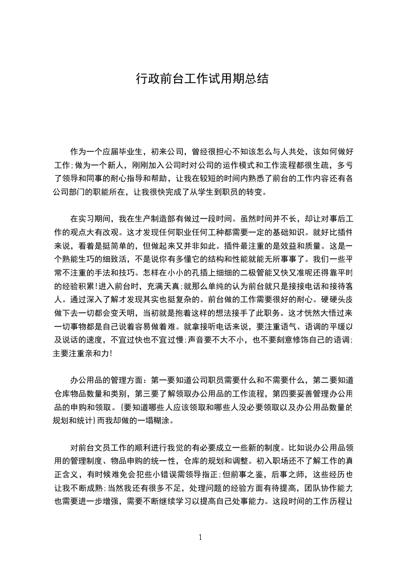 在行政部从事前台三个多月以来,工作主要可以归纳总结如下:1认真做好来电的接听、访客的接待工作,做好订水工作;