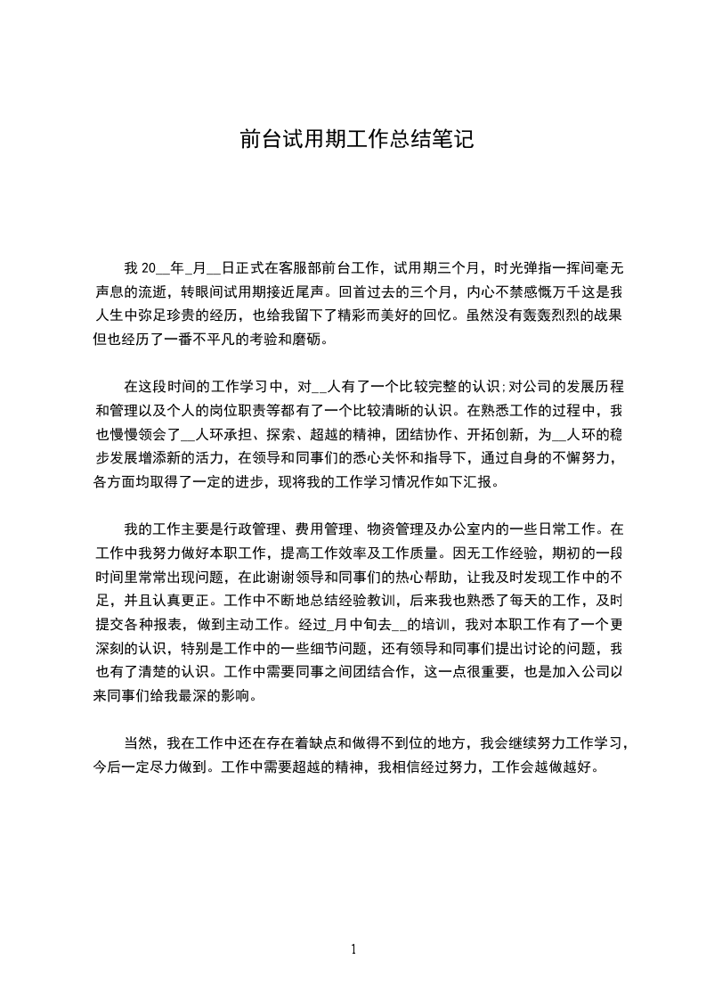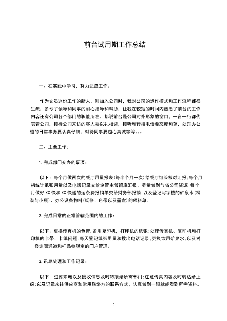 时间总是转瞬即逝,在前台工作的两个多月,我的收获和感触都很多,任职以来,我努力适应工作环境和前台这个崭新的工作岗位,认真地履行自己的工作职责,完成各项工作任务。
