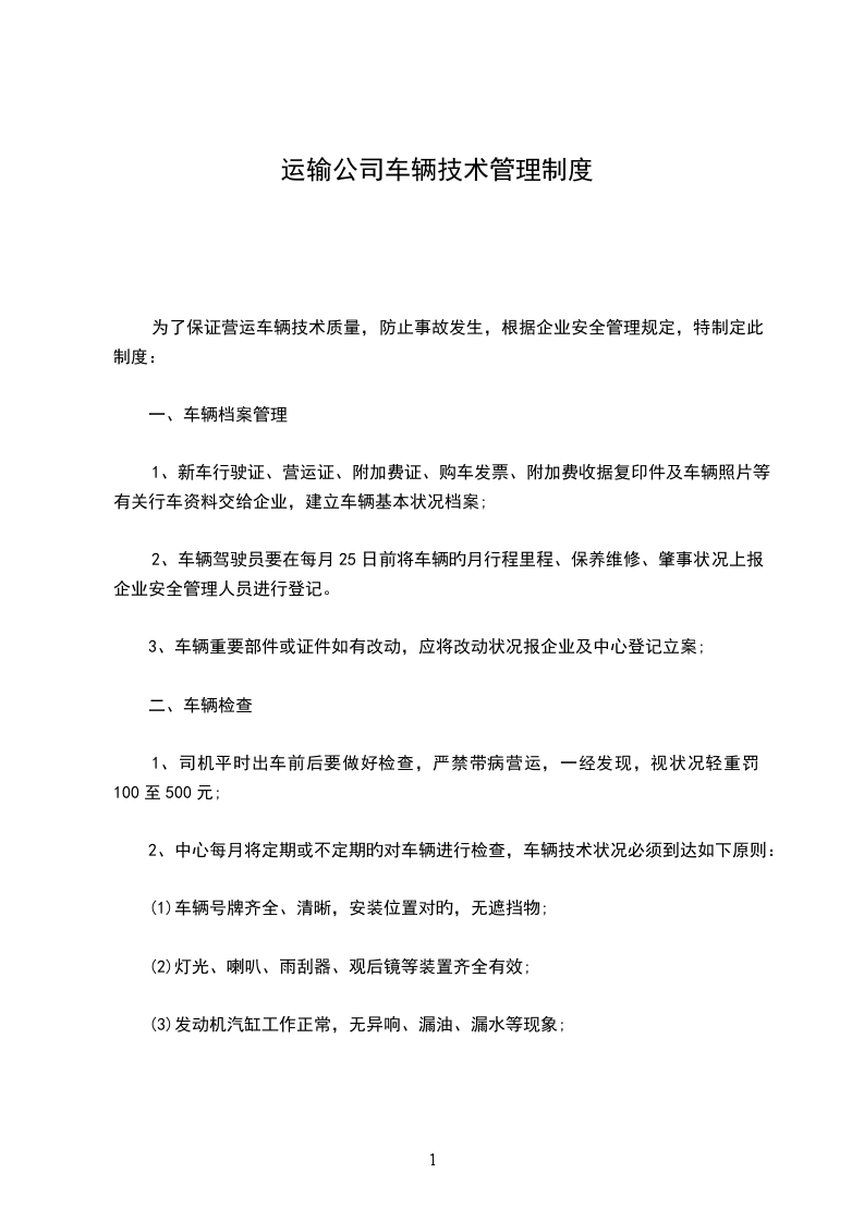 为了保证营运车辆技术质量,防止事故发生,根据企业安全管理规定,特制定此制度: