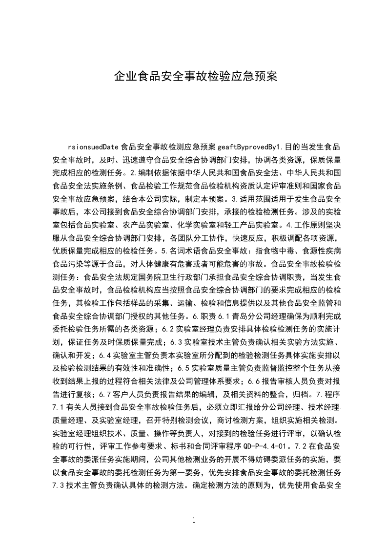 rsionsuedDate食品安全事故检测应急预案geaftByprovedBy1.目的当发生食品安全事故时,及时、迅速遵守食品安全综合协调部门安排,协调各类资源,保质保量完成相应的检测任务。2.编制依据依据中华人民共和国食品安全法、中华人民共和国食品安全法实施条例、食品检验工作规范食品检验机构资质认定评审准则和国家食品安全事故应急预案,结合本公司实际,制定本预案。3.适用范围适用于发生食品安全事故后,本公司接到食品安全综合协调部门安排,承接的检验检测任务。涉及的实验室包括食品实验室、农产品实验室、化学实验室和轻工产品实验室。4.工作原则坚决服从食品安全综合协调部门安排,各团队分工协作,快速反应,积极调配各项资源,优质保量完成相应的检验任务。5.名词术语食品安全事故:指食物中毒、食源性疾病、食品污染等源于食品,对人体健康有危害或者可能危害的事故。食品安全事故检验检测任务:食品安全法规定国务院卫生行政部门承担食品安全综合协调职责,当发生食品安全事故时,食品检验机构应当按照食品安全综合协调部门的要求完成相应的检验任务,其检验工作包括样品的采集、运输、检验和信息提供以及其他食品安全监管和食品安全综合协调部门授权的其他任务。6.职责6.1青岛分公司经理确保为顺利完成委托检验任务所需的各类资源;6.2实验室经理负责安排具体检验检测任务的实施计划,保证任务及时保质保量完成;6.3实验室技术主管负责确认相关实验方法实施、确认和开发;6.4实验室主管负责本实验室所分配到的检验检测任务具体实施安排以及检验检测结果的有效性和准确性;6.5实验室质量主管负责监督监控整个任务从接收到结果上报的过程符合相关法律及公司管理体系要求;6.6报告审核人员负责对报告进行复核;6.7客户人员负责报告结果的编辑,及相关资料的整合,归档。7.程序7.1有关人员接到食品安全事故检验任务后,必须立即汇报给分公司经理、技术经理、质量经理、及实验室经理,召开特别检测会议,商讨检测方案,组织实施相关检测。实验室经理组织技术、质量、操作等负责人,对接到的检验任务进行评审,以确认检验的可行性,评审工作参考要求、标书和合同评审程序QD-P-4.4-01。7.2在食品安全事故的委派任务实施期间,公司其他检测业务的开展不得妨碍委派任务的实施,要以食品安全事故的委托检测任务为第一要务,优先安排食品安全事故的委托检测任务7.3技术主管负责确认具体的检测方法。确定检测方法的原则为,优先使用食品安全综合协调部门指定的检测方法,其次为国标方法,最后为行业标准方法,如果需要使用国际方法或非标方法,应得到食品安全综合协调部门的书面同意。在使用非标方法前,应当就所使用的非标方法提交委托检验的部门进行确认,得到确认后方可使用,提交材料包括: