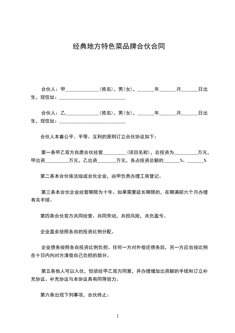 经甲乙双方友好协商、达成以下合伙协议: