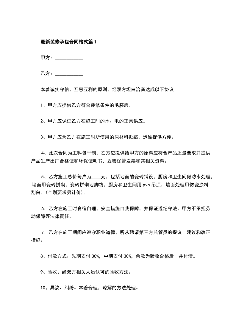 6、工程造价:装修总金额为:______________元整。材料及装修费用由乙方先提供,待甲方验收合格后,按照装修总额给予付款。