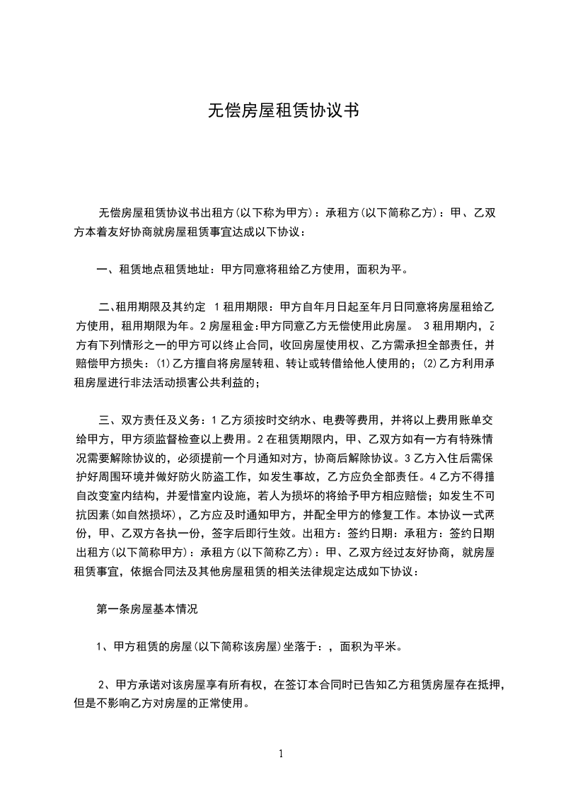 无偿房屋租赁协议书出租方(以下称为甲方):承租方(以下简称乙方):甲、乙双方本着友好协商就房屋租赁事宜达成以下协议: