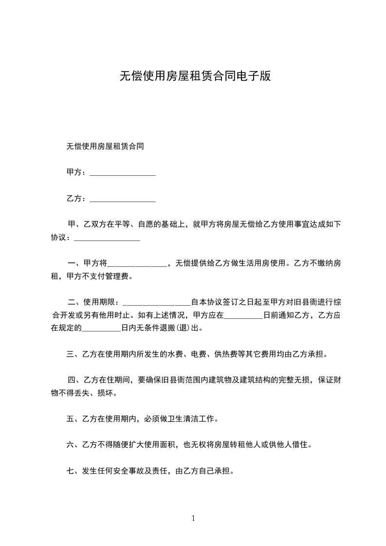 二、租用期限及其约定1租用期限:甲方自年月日起至年月日同意将房屋租给乙方使用,租用期限为年。2房屋租金:甲方同意乙方无偿使用此房屋。3租用期内,乙方有下列情形之一的甲方可以终止合同,收回房屋使用权、乙方需承担全部责任,并赔偿甲方损失:(1)乙方擅自将房屋转租、转让或转借给他人使用的;(2)乙方利用承租房屋进行非法活动损害公共利益的;