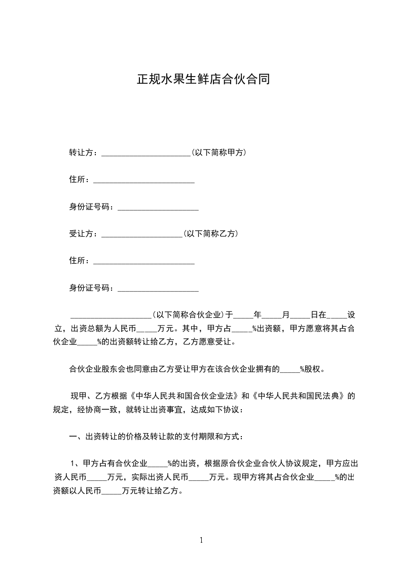 1、甲方占有合伙企业_____%的出资,根据原合伙企业合伙人协议规定,甲方应出资人民币_____万元,实际出资人民币_____万元。现甲方将其占合伙企业_____%的出资额以人民币_____万元转让给乙方。
