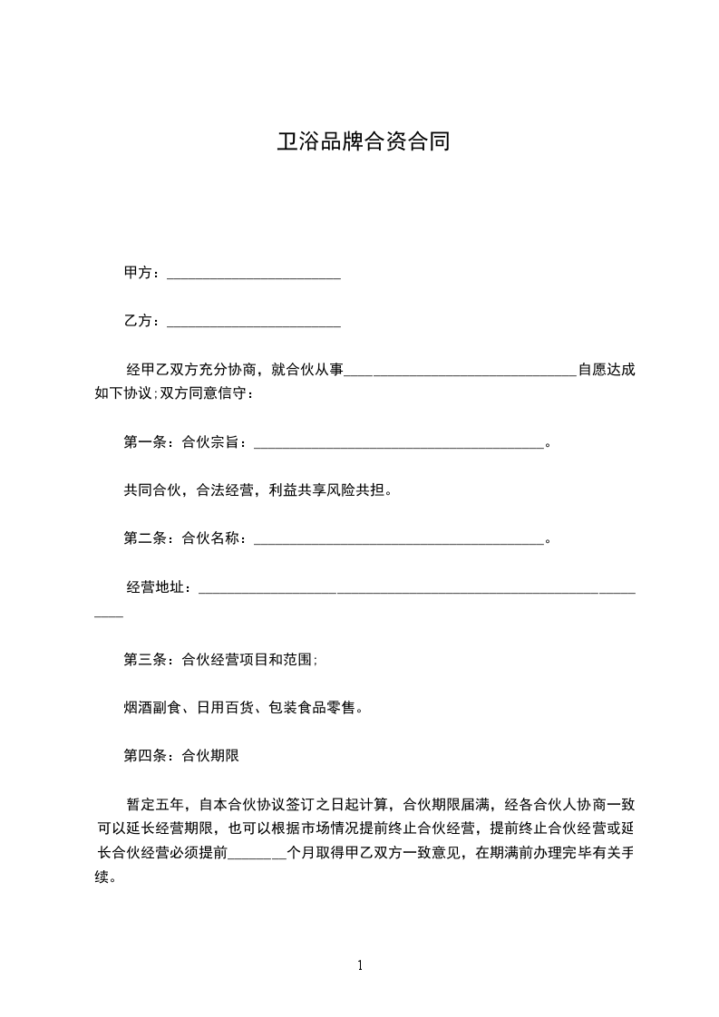 暂定五年,自本合伙协议签订之日起计算,合伙期限届满,经各合伙人协商一致可以延长经营期限,也可以根据市场情况提前终止合伙经营,提前终止合伙经营或延长合伙经营必须提前________个月取得甲乙双方一致意见,在期满前办理完毕有关手续。