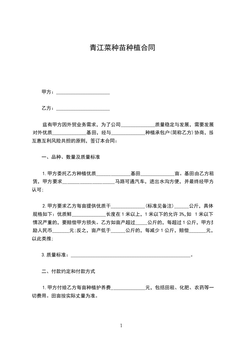 兹有甲方因外贸业务需求,为了公司______________质量稳定与发展,需要发展对外优质______________基田,经与______________种植承包户(简称乙方)协商,按互惠互利风险共担的原则,签订本合同: