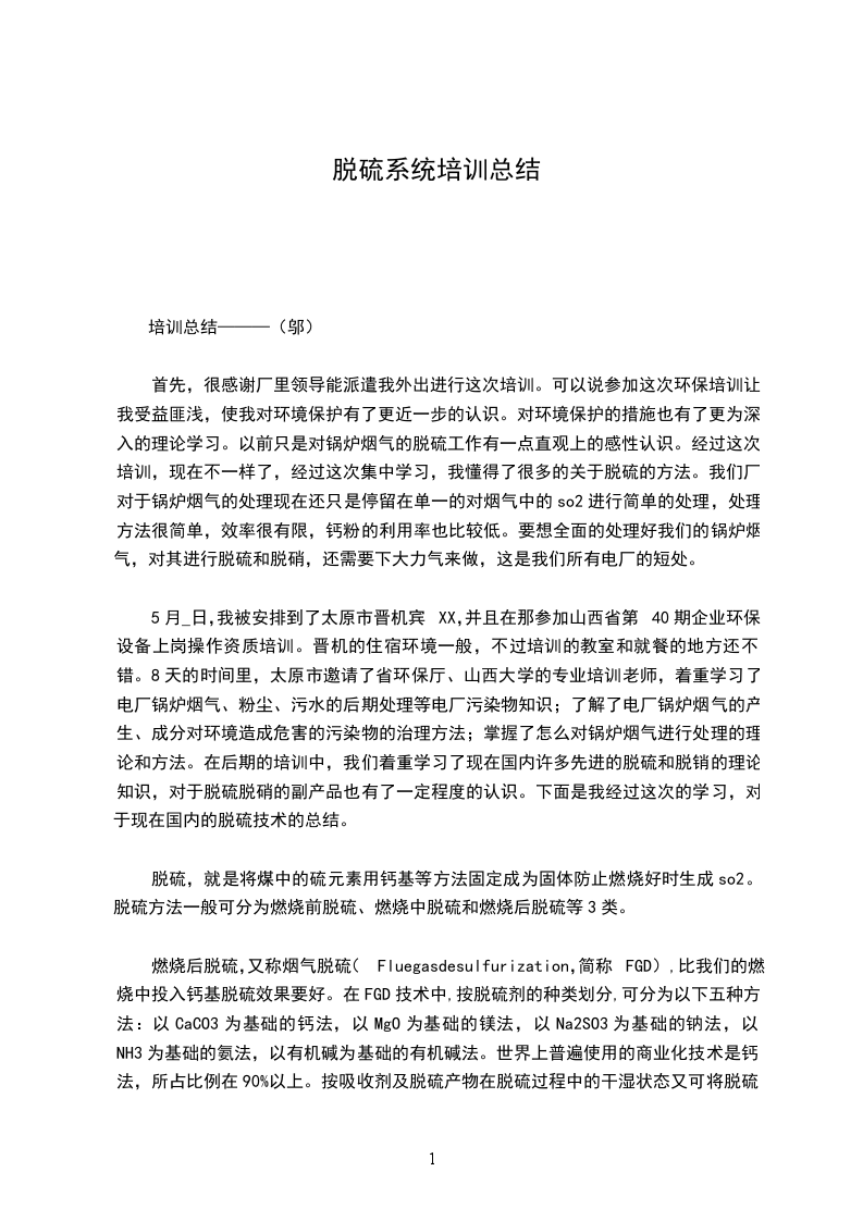 5月_日,我被安排到了太原市晋机宾XX,并且在那参加山西省第40期企业环保设备上岗操作资质培训。晋机的住宿环境一般,不过培训的教室和就餐的地方还不错。8天的时间里,太原市邀请了省环保厅、山西大学的专业培训老师,着重学习了电厂锅炉烟气、粉尘、污水的后期处理等电厂污染物知识;了解了电厂锅炉烟气的产生、成分对环境造成危害的污染物的治理方法;掌握了怎么对锅炉烟气进行处理的理论和方法。在后期的培训中,我们着重学习了现在国内许多先进的脱硫和脱销的理论知识,对于脱硫脱硝的副产品也有了一定程度的认识。下面是我经过这次的学习,对于现在国内的脱硫技术的总结。