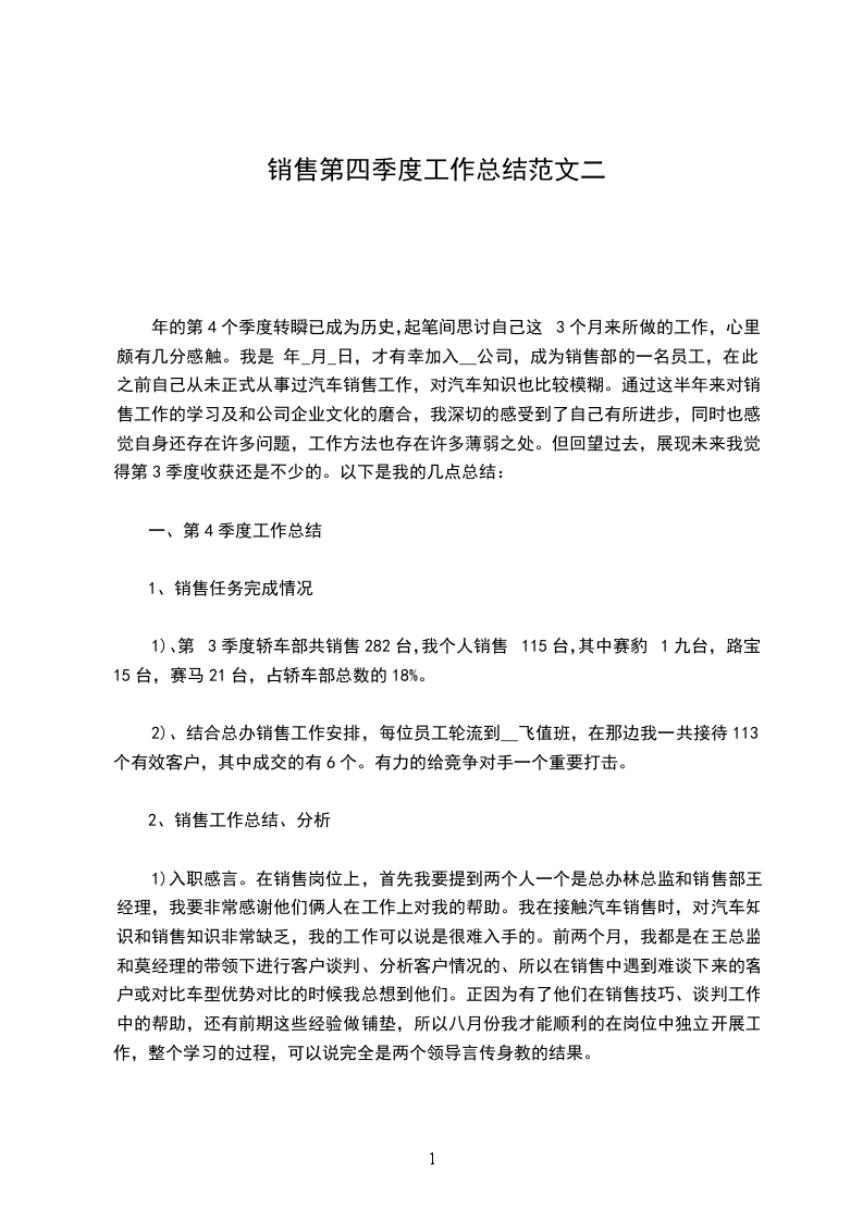 年的第4个季度转瞬已成为历史,起笔间思讨自己这3个月来所做的工作,心里颇有几分感触。我是 年_月_日,才有幸加入__公司,成为销售部的一名员工,在此之前自己从未正式从事过汽车销售工作,对汽车知识也比较模糊。通过这半年来对销售工作的学习及和公司企业文化的磨合,我深切的感受到了自己有所进步,同时也感觉自身还存在许多问题,工作方法也存在许多薄弱之处。但回望过去,展现未来我觉得第3季度收获还是不少的。以下是我的几点总结:
