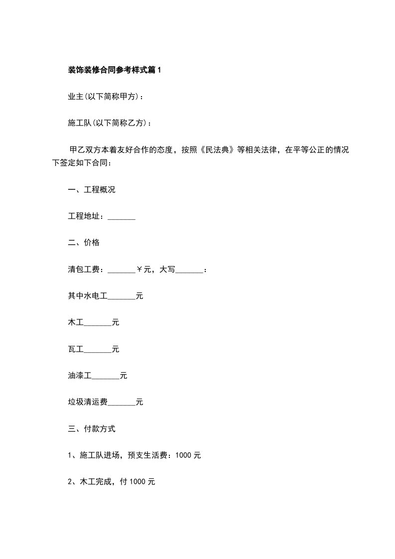 七、付款方式:合同协议后,甲方预付35%工程款_________元;水电等隐蔽工程验收后支付40%工程款_________元;泥工,木工中间工程验收后支付20%工程款_________元,工程竣工验收合格后5日内支付5%的尾款_________元。