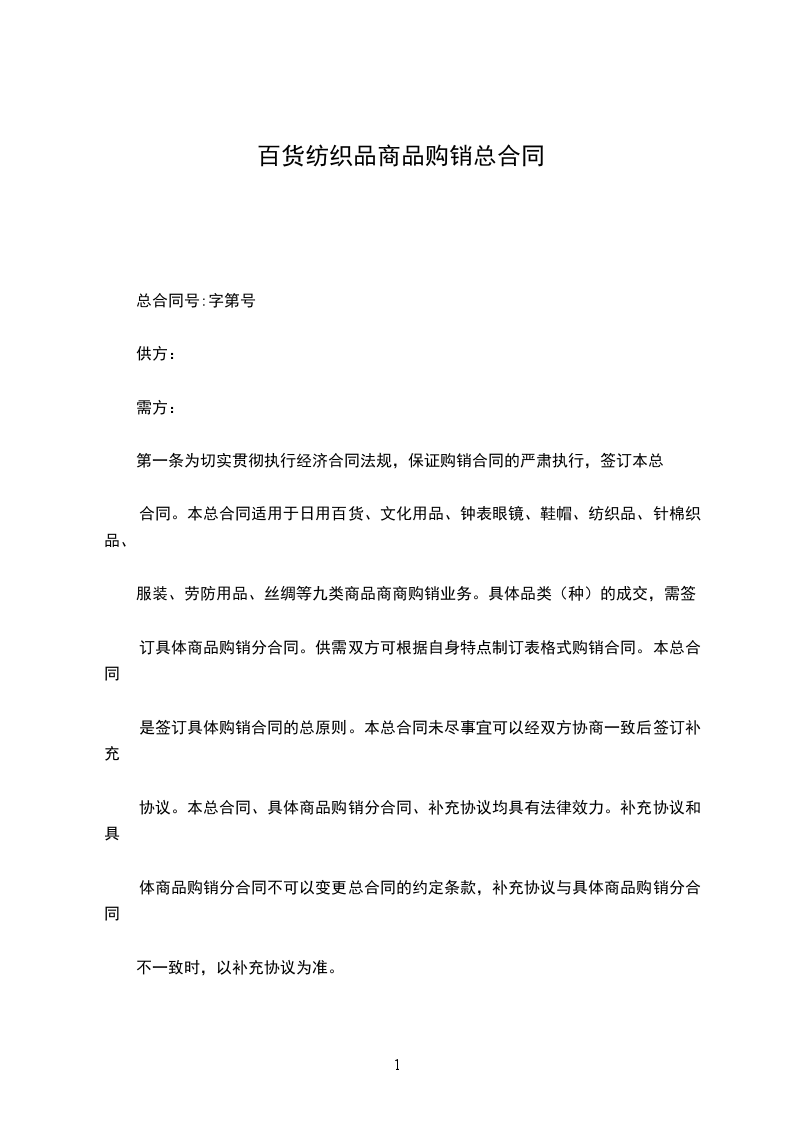 合同。本总合同适用于日用百货、文化用品、钟表眼镜、鞋帽、纺织品、针棉织品、
