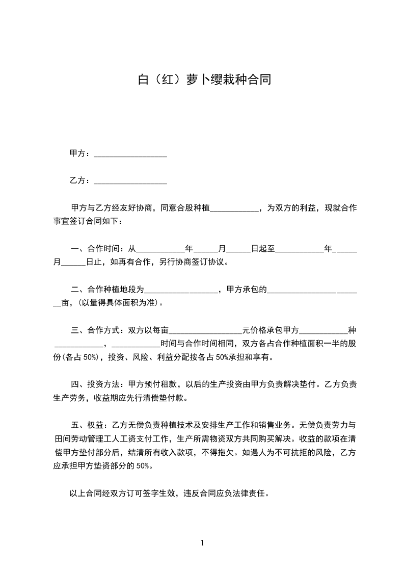 五、乙方就付早方种植管理费、按成品菜每棵______________元(亩______________株,______________元)。