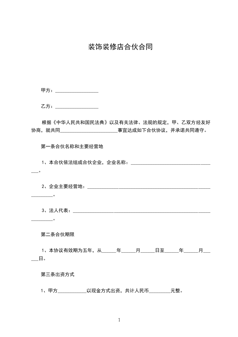 4、本合伙出资共计人民币_________元整。合伙期间各合伙人的出资为共有财产,不得随意请求分割,合伙终止后,所有财产为各合伙人平分。