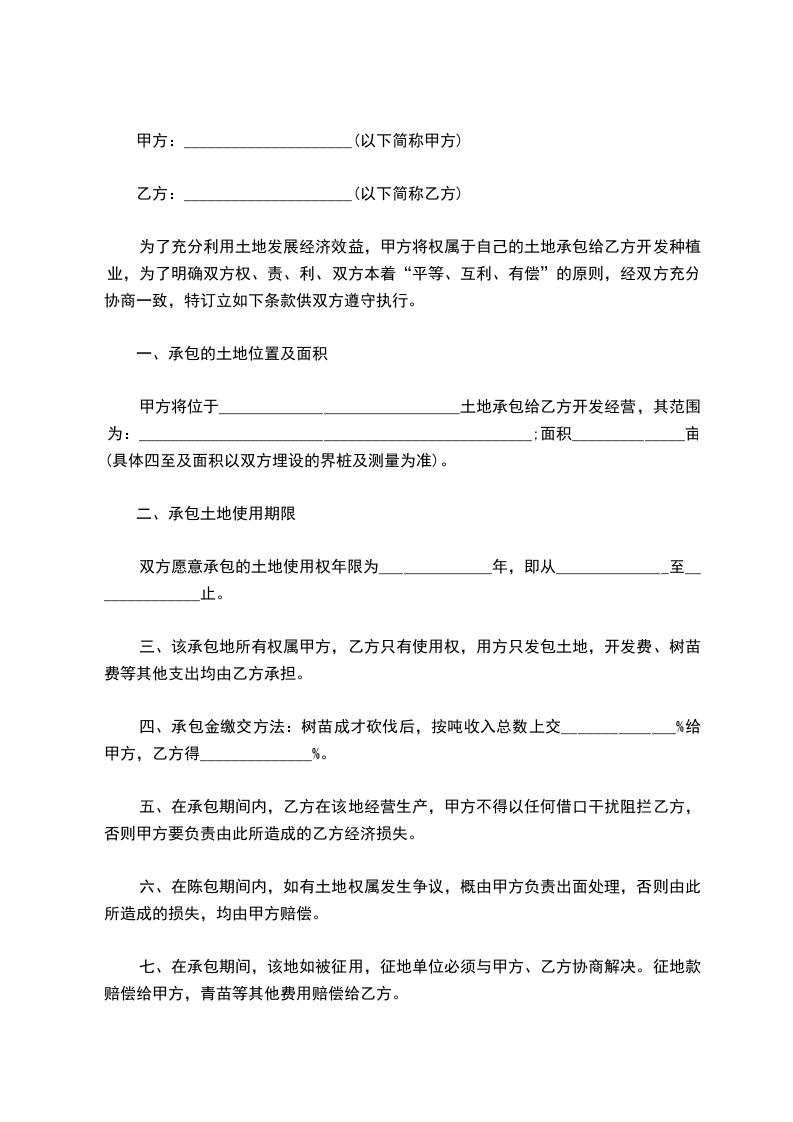 经甲方同意将位于______________________________树木种植工作交由乙方承包。为明确双方的权利、义务和责任,现经双方友好协商,达成以下条款: